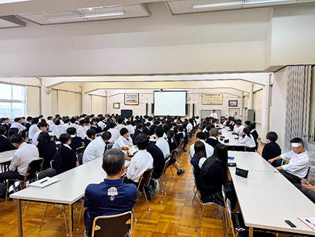 10月9日、銚子商業高等学校にて、1学年生徒全員と3学年海洋科 海洋環境コース生徒を対象に、銚子市と風力発電のかかわりについて学び、銚子市沖で検討されている洋上風力発電について基礎的な理解を深めるため、講演会を行いました。これまで行った4回の出前授業に続いて今回は第5弾となります。